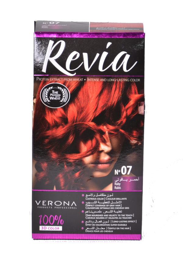 PERMANENT COLOR CREAM REVIA 07 – RUBBY,Hair coloring cream REVIA ensures an extremely lasting, deep and brilliant color. The cosmetic’s formula contains a complex of active substances, which protect hair structure and care for its condition: wheat proteins have nutritional properties; thanks to silicon hair becomes smooth, shiny and pleasantly soft to the touch; amino acids appropriate moisturizing. Your hair will gain an intense, attractive color and exceptional luster